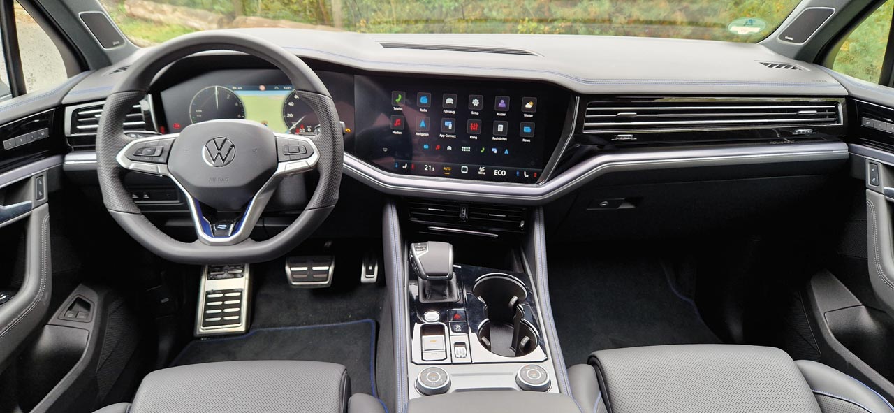 Der bis zu 250 km/h schnelle Touareg R eHybrid beschleunigt von 0 auf 100 km/h in nur 5,1 Sekunden und bietet beeindruckende 340 kW/462 PS Systemleistung. Mit 700 Nm Drehmoment und 4MOTION Allradantrieb fühlt er sich auf der Rennstrecke ebenso wohl wie im urbanen Umfeld oder im Gelände und kann es mit einer Anhängelast von bis zu 3,5 Tonnen aufnehmen. Das Schalten übernimmt eine 8-Gang-Automatik mit Tiptronic.